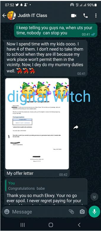 She is the founder and trainer of Digital Witch Community where people learn how to earn remotely. The community has about 30,000 students with more than 70% actively working remotely.